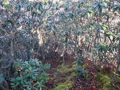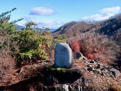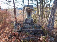 元の山道に戻り、冬枯れの雑木林に覆われた尾根を辿ると、「十二山入口」の道標がある。左に分かれる脇道に入ると、小ピークを越えて結構下り、次のシャクナゲに覆われた小ピークも越え、短い急坂で三つめの小ピークに登り着くと「十二山神」の石碑のある十二山に着く。石碑の傍には赤錆た鎌が供えられている。