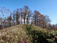 頂上は笹原に覆われ、切り開き道の終点に三角点標石と山名標柱がある。唐松や岳樺に囲まれ、浅間連峰の方向のみ眺めが開ける。明るくて爽快な頂だが、展望に関しては登山口の道標に記されていた通り、天狗岩と十二山の方が優れている。