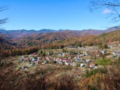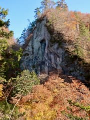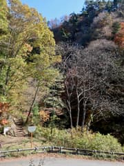 世立八滝は、野反湖方面に出かけてR405を走るとその入口を通り掛るので、以前からちょっと気になっていたスポットだ。正直、松岩山が存外に良くて満足していたので、サクッと割愛しても良いかな、とも思ったのだが、入口まで来てみるとこの辺りの紅葉は見頃。この機を逃す訳にはいくまい。滝見ドライブインの駐車場(無料、WC有)に車を置く。観光客の車も数台ある。ドライブインはオフシーズンなのか、営業していない。