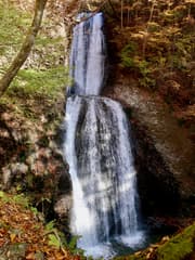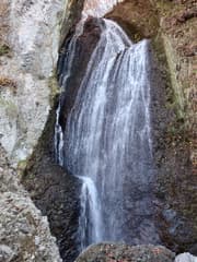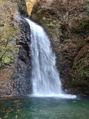 八滝を一周すると2時間かかり、急坂続きの山道とのことなので、ザックに水とフリースだけを入れ、登山靴を履いて出発する。まず、入口から大仙(おおぜん)の滝へ。両岸に岩壁が峙つ八石沢川の峡谷に入ると、すぐに滝が現れる。深く大きな釜を持つ豪快な滝だ。