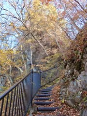 入口に戻り、尾根上の急な階段道を登る。大きなカメラを抱えたおじさんが、ぐったりと疲れた様子で降りて来る。この道は観光客にはちょっと厳しい。階段道は急峻な岩稜を登ると、今度は谷底に向かって急降下。階段と手摺が完備しているものの、踏み外したらタダでは済まない急勾配だ。対岸の岩壁に、天狗の足跡と言われる大きな窪みを見る。