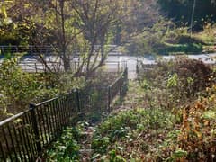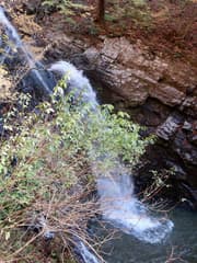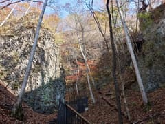 尾根を引き返し、金比羅山を下って、分岐点から八滝最後の仙の滝に向かう。この滝だけ依田尾川にある。仙の滝へは岩壁の下をトラバースする。土砂の押し出し、落石や倒木によって手摺柵が倒壊し、道が荒れている。