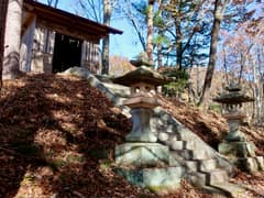 ヒイコラ登って尾根に戻り、平坦な尾根を先に辿ると諏訪神社が建つ。このすぐ先が今朝、通った町道暮坂引沼線で、駐車場がある。