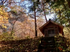 これで八滝の見物は終了。遊歩道を下り、依田尾川を橋で渡る。林道の広場を横切ると、木立に囲まれた小さな高台の上に天狗神社が建つ。背後には岩峰が聳え、神さびた雰囲気がある。草藪っぽい遊歩道を下ると、R405に着く。滝見ドライブインは目と鼻の先だ。