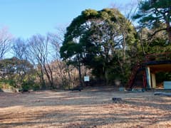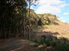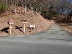 権現平から僅かに登ると車道(県道益子公園線)に出る。車道の左向かいに駐車場があり、「益子町森林公園案内板」が建つ。それによると、この辺り一帯にキャンプ場や多目的広場などの公園施設があるらしい。ただし、案内板の老朽化具合や周囲の雰囲気から察するに、利用者がいなくて廃れていそう。
