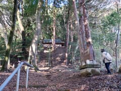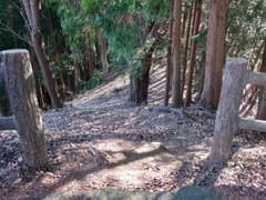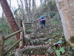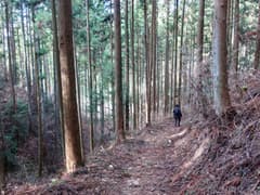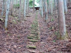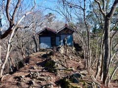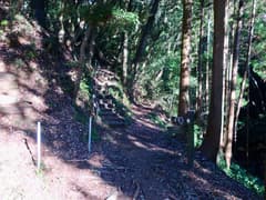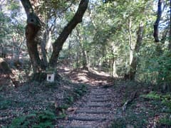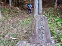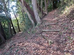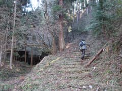 小さな沢を橋で渡り、良く刈り払いされた階段道を上がる。斜面をジグザグを切って登り、枝尾根の上に出る。その先はなだらかな枝尾根を絡んで登る。参道らしくて楽な道だ。やがて、岩場を混えた急斜面に突き当たるが、山道はその左をゆるゆるとトラバースして登る。背後から、ヤッホーと叫ぶ子供の声が聞こえて来る。どうも子供連れの一団が我々の後から登って来ているようだ。子供は元気だなあ。じきに追い付かれるだろう。