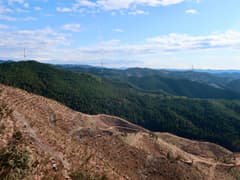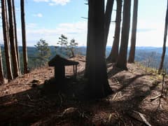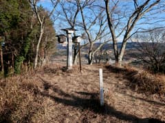 頂上には数枚の山名標識と流造の石祠があり、祠の前には酒瓶が転がっている。その先は広大な伐採斜面の上端に出て、東から南にかけて展望が開ける。東方には北から南へなだらかに高度を下げて尾根が幾重にも折り重なる。目ぼしいピークは見当たらない。南方には、霞んで微かにだが、筑波山の双耳峰を遠望する。中景にあって、鍋を伏せたような山容が少し目立つ山は、地図で見ると高倉山と言う山らしい。