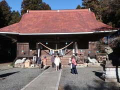 明けて2020年の元旦は快晴。今日は2座目の松倉山(まつくらさん)に登る。その前に、新年を迎えたらまず初詣ということで、益子町小宅(おやけ)の亀岡八幡宮に立ち寄る。R294沿いに赤鳥居の建つ参道入口がある。ここから神社下の駐車場まで車で入ることもできるが、立派な参道を歩きたくなり、入口から入って直ぐの駐車場に車を置く。