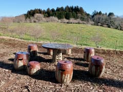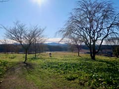 参拝後、神社の隣に開けた公園のような場所があるので立ち寄ってみる。丘の上一面にロゼット状の菜の花の畑が広がり、展望が開けて周囲の里山村落が眺められる。菜の花畑に点在する小さな塚は、どれも古墳だそうだ。「ましこ世間遺産 No.39 小宅古墳群からの風景パノラマ」という立て標識がある。ご当地益子焼のベンチもあり、風景を楽しんで寛げる。昨日登った芳賀富士の小さいながらも端麗な山容も見える。風光明媚な丘で、菜の花と桜が咲く時期は益々良いだろうなあ。また、秋には曼珠沙華が咲き乱れるそうである。