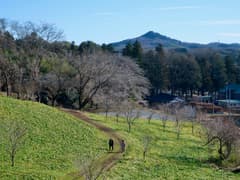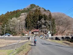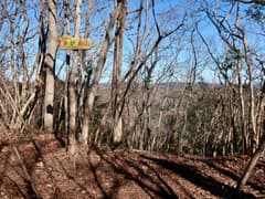 下山は、明るい冬枯れの雑木林の中の車道を降りる。途中、左に鷹ノ巣、鷲ノ巣への関東ふれあいの道を分ける(ただし、現在は倒木のため通行止め。迂回路が設定されている)。程なく山麓に下り着き、大規模な養鶏場を左に見ながら車道を歩く。鎌倉山の裾を回り、登山口の前を通って、車を置いた「ふるさとセンター茂木」に戻る。