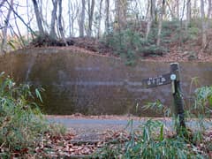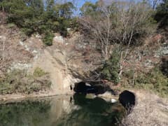 寄り道を終えて、松倉山に向かう。R123から茂木市街を経由して県道那須黒羽茂木線を走り、大河の風格のある那珂川を大藤橋で渡る。支流の木須川に沿って県道牧野大沢線に入ると、木須川の洞門がある。これは、木須川の蛇行部をショートカットして岩山に穿たれた河川トンネルだ。案内看板によると、トンネルの長さは47m、幅15m、高さ2.6m。この地は那珂川氾濫時の逆流による洪水被害が大きかったため、地元住民が資金を集め、2年に渡る難工事の末、大正2(1913)年にトンネルを完成させたとのこと。房総半島にも川廻しのトンネルが多数あるが、これはかなり大きなトンネルだ。大変興味深い。