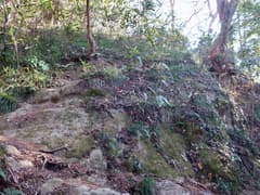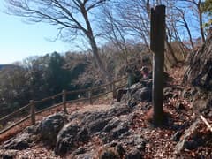 切り通しに戻ると、ご一家が到着し、先頭の子供は嬉々としてロープに取り付く。子供はこういう場所は好きだよなあ。帰省の良い思い出になるのではなかろうか。再び観音堂に立ち寄って、日溜りでパンとペットボトル飲料の昼食を摂る。その間に歓声が下の道を通り過ぎたので、ご一家は下山したようだ。