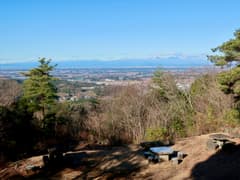 本堂右脇にはコウヤマキの大木があり、その奥から山道に入る。常緑の広葉樹林に覆われて、雰囲気の良い道だ。程なく芝生の広場に出る。ベンチや展望台もあり、ここが権現平のようだ。周囲の樹林が育って展望は限られるが、益子市街や冠雪した日光連山の方面が良く眺められる。