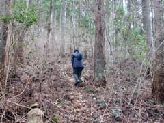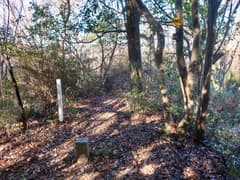ご一家もおじいさんの案内で松倉山山頂まで行くとのこと。我々は一足先に山頂に向かう。石段を降りて広く平坦な尾根を直進し、枝尾根の切り通しに差し掛かると左に山道が分かれる。入口にロープが張られた段差があるので、こういう個所が苦手なS母を残して山頂に向かう。急なのは最初だけで、笹の間を緩く登って直ぐに松倉山の頂上に着く。