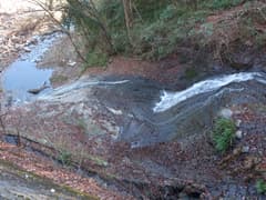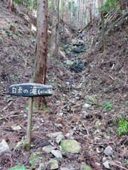 高い杉林に覆われて、ちょっと寒々しい雰囲気の谷間を登ると、すぐに「白糸の滝」の標識がある。この滝は雨が降ったとき限定の滝らしく、今は水が全くない。