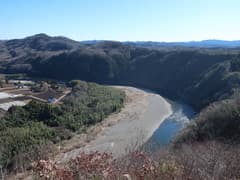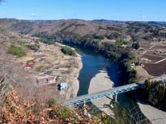 小さな山と侮っていたが、この登りは結構険しい。S母は途中まで登ったところで待つと言い始めるが、なんとか登って、展望台に着く。ここは那珂川に面した岩場で、ゆったりとカーブして流れる那珂川の大河っぷりと周辺の長閑な山村を俯瞰する眺めが素晴らしい。また、今はよく晴れているが、川霧によって生ずる雲海の撮影地として有名そうだ。ただ、川沿いの平地を良く見ると浸水の跡が残っていて、氾濫の威力には驚かされる。