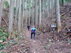 温泉旅行の最終日。S&Sの帰りは小山駅15:32発の新幹線を予約しているので、短い行程の山歩きとする。大黒屋をチェックアウトし、アウトレットを避けて南下。黒磯市街を経由して萬蔵山に向かう。萬蔵山には西麓の尻高田から登っている山行記録が多いが、時間短縮のため、南麓の塩畑から林道八溝縦貫線に入って、中腹から登ることにする。途中(堂平)にも萬蔵山への道標があるが、藪に覆われてほとんど廃道化している。その先、尻高田から登る道と林道の交差点の路側に車を置き、「満藏山参道」の石碑から山道に入る。