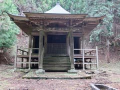 白糸の滝から右へ向かい、切り返して登ると、急な参道石段が現れる。石段は苔むして微妙に傾ぎ、年代を感じさせる。石段を登り詰めると小広い境内に着き、雲光教寺の本堂が建つ。柱組には薄く苔が付いて老朽化し、堂内は吹き曝しで荒廃気味だ。しかし、こんな山中に立派なお堂が建つとは、やはり昔の人の信仰心の篤さに感服するしかない。
