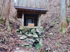 堂の左前には「戦勝祈願」と刻まれた灯籠と如意輪観音の石像、右奥には立派な宝篋印塔と石祠、「満藏山改修記念碑」の石碑が建つ。この石碑によると、倒木のため本堂が破損したので大改修を行ったとのこと。碑の建立は平成八年だから、そう古い話ではない(と思ったが、四半世紀も前だ^^;)。さらに奥には改修時に寄進されたと言う不動尊がある。
