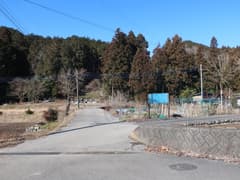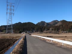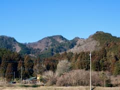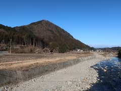 今日は快晴。風が少し冷たいので薄手のフリースを着て歩き出すが、1月にしては妙に暖かい。行川に沿って明るく開けた田園風景や、これから辿る次石山〜城山の稜線を眺めながら、のんびり歩く。車通りは少ないし、車道歩きも散歩気分で楽しい。しかし、河原には重機が入った最近の工事の跡が広がり、昨秋の台風で氾濫などの被害が出たようだ。