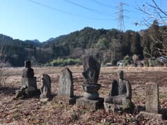 平野橋を渡り、車道が左折する角から林道に入る。体が温まってきたのでフリースを脱ぎ、厚手の長袖シャツで歩く。すぐに未舗装道となり、小さな渓流に沿って登る。道は少しぬかるんで、新しい轍が残っている。ふと、右手の斜面を見ると、杉林の間に新旧の石祠が並んで建っている。