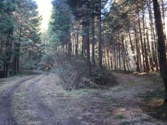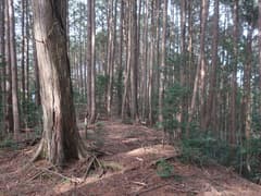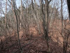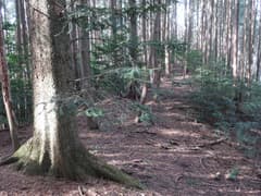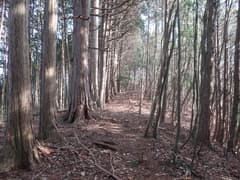 最初は低い尾根だが、登るに連れて尾根の形がはっきりしてくる。常緑のヒサカキ?の木が多い。藪はなく、微かな踏み跡もあって歩き易い。登り着いた東尾根の305m標高点は檜林に覆われて展望なし。ここから小倉城山の手前まで、日光・鹿沼市境を辿る。