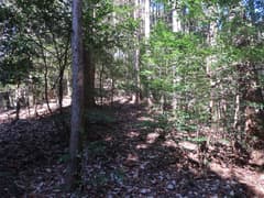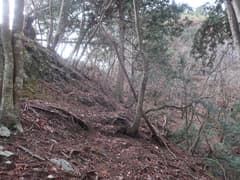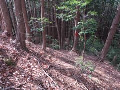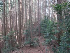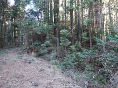 最初のY字の分岐は右の谷へ。地形図では破線路だが、車でも辛うじて通れそうな作業道が谷の奥へ延びている。右から小沢を合わせる地点で、305m標高点から南に落ちる枝尾根に取り付く(この地点は、ふみふみぃさんの記事の軌跡入り地図で良く把握できた)。