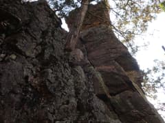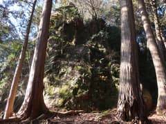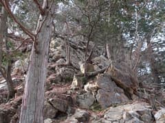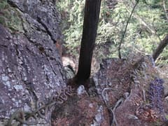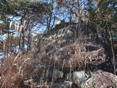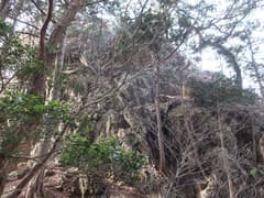 左へ市境の尾根を登る。引き続き藪はなく、歩き易い。傾斜が増すと、やがてネットの山行記録の写真でも見た大岩、というか、かなり高い崖に突き当たる。