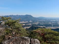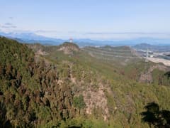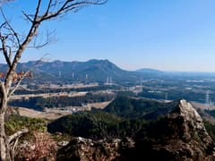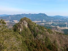 大岩は右を巻き、急斜面をよじ登って尾根に復帰する。大岩の岩頭に立ち寄ってみると、足元がすっぱり切れ落ちた岩場となり、山麓の行川沿いの田園の向こうに古賀志山、その右には鍋を伏せたような多気山(たげさん)を望む。