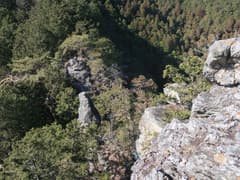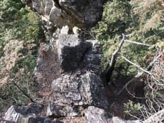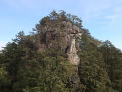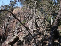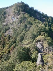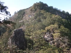 岩場の上に出て振り返ると、東峰の威圧的は岩壁の前に、お烏帽子岩がニョッキリと突き立っていて、観音様に見立てたのもうなづける。それにしても、標高500mに満たない低山にこんな険しい岩場が秘められているとは、侮れない。