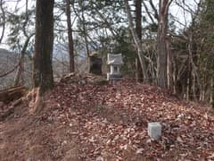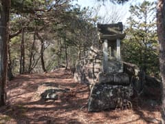 さらに岩稜を攀じ登ると、赤松に囲まれた小平地の頂に登り着く。ここが次石山の東峰だ。小平地の中央には立派な石祠が祀られ、周囲には梵天の竹竿が残っている。