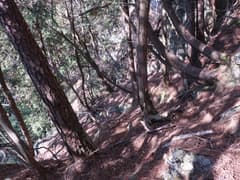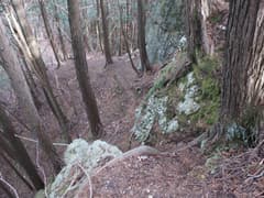 東峰からは、南から巻いて次石山の鞍部に出たネットの山行記録が頭にあったので、南面へ下る踏み跡を見つけて下ってみる。やがて踏み跡は消えるが、岩壁の基部の急斜面を斜めに下って、何とか鞍部に行けそうだ。