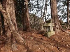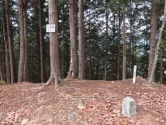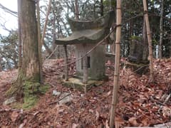 頂上は檜林に囲まれた小平地で、展望はない。三角点標石と山名標識がある他、頂上の一角に石祠がある。祠の銘は昭和八年四月吉日と比較的新しい。古く壊れた石祠もあるので建て直されたのだろう。今日の山行の核心部は過ぎたので、一息入れてのんびりする。
