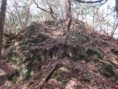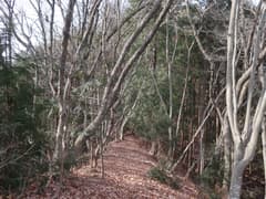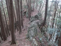 ここから北の小倉城山へは、低山らしい雰囲気の尾根歩きとなる。ヒサカキが混じる檜林の尾根を緩く下り、登り返して小さな岩場を越えると小ピークに着く。