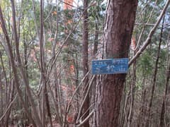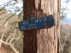 小さなアップダウンをこなし、雑木林に入って登ると、雷電山に着く。西麓を向いた石祠があり、檜の幹には「SHCカワスミ雷電山」の半分壊れた山名標識が掛かっている。