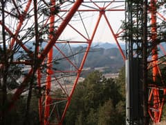 雷電山を過ぎると小さな岩場の上に出て、明瞭な踏み跡で下る。大岩を過ぎ、稜線を左折。行く手には木の間越しに紅白鉄塔が見える。尾根を下り、右側がちょっと切れ落ちた岩稜を通過する。