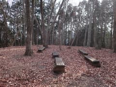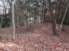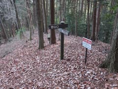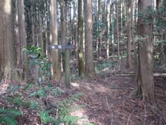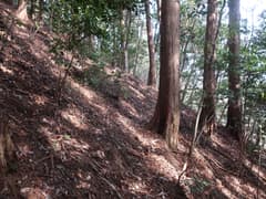 ルートはここで右に折れる。檜林の尾根を進むと、尾根を横断して掘り窪めた堀切跡が現れる。さらにベンチが置かれた平坦地を過ぎると、「八方館」の道標が建つ。ここは小倉城の一角だそうだ。