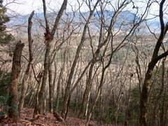 与松山の先も小さなアップダウンと、所々に露岩のある尾根を進む。木立を透かして右に曲がって続く山並みが見え、あの先が小倉城山だろう。細尾根を過ぎ、檜とヒサカキのなだらかな尾根を辿ると、「SHCカワスミ与松山」の山名標識のある平坦なピークに着く。