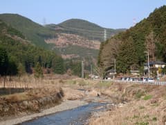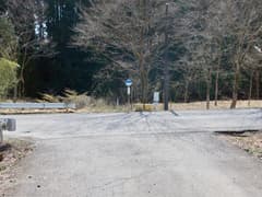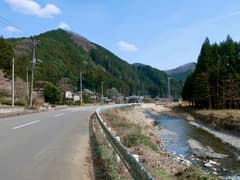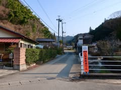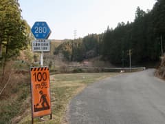 朝方の冷たい空気は残っているが、良く晴れて陽射しはポカポカと暖かく、今日はかなり気温が上がりそうだ。県道280号線に入り、ポツポツと民家のある山間の車道を緩く上がる。途中には六角形の青い標識が立ち、この道が確かに県道であることを示している。