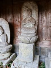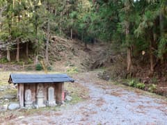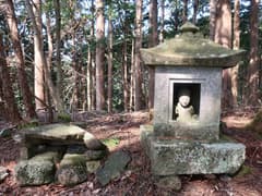集落の奥から峠道の入口まで戻る。この地点には屋根が差し掛けられた2体の石仏と1基の石碑がある。中央の石仏は智拳印を結んでいるように見えるから大日如来かな。右の石碑には「日支事変 馬力神 昭和十四年 大貫新作建之」と刻まれている。