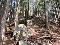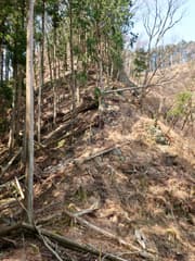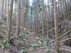 さらに稜線を辿り、地形図の破線路が越える鞍部に着く。峠道の痕跡はほとんどない。鞍部から南側の杉林の斜面を下る。作業道を横断し、けもの道を利用して下って行くと左(東)に寄り過ぎたので進路を修正。520m圏の小鞍部に着く。ここから小さな窪の中を下る。地形図で破線が記載されている場所だが、道型は見当たらない。