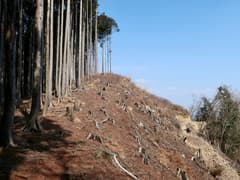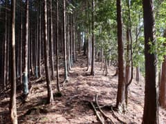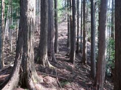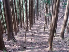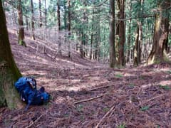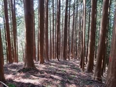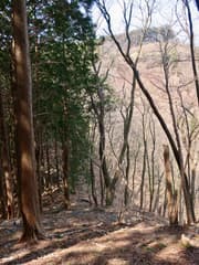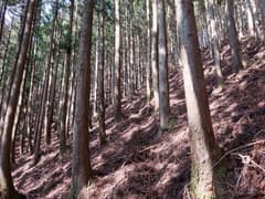 展望地から戻り、杉林に覆われた幅広くなだらかな稜線を下る。枝打ちされた杉の枝葉が地面を覆い、歩くのに大きな差し障りはないが、弓のように反った枝の一端を踏むと他端が跳ね上がって手や顔を打つことがあるので(と言うか打たれた^^;)注意。