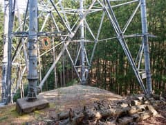 三角点標石は鉄塔基部の傍らにある。山名標識が見当たらないと思ったら、鉄塔の陰に隠れてあった。なお、鉄塔の銘板によると、この鉄塔(南いわき幹線279号)は1996年5月製で、高さは117mである(ちなみに鳴蟲山の紅白鉄塔は132m)。