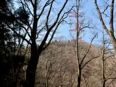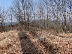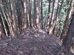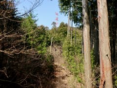 528m標高点から急坂を下り、相変わらず杉林の稜線を辿る。左斜面は若い植林帯となり、陽当たりの良い場所には灌木藪が繁って少々煩わしい。行く手にはだいぶ近づいて紅白鉄塔を仰ぐ。右斜面は伐採地となり、稜線直下まで作業道が通じている。やがて、地形図の等高線の詰まり具合の通り、急斜面の長い登りに差し掛かる。最後はけもの道を利用してジグザグに登り、頂上稜線の一角で石祠のあるピークに着く。