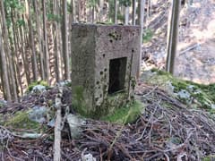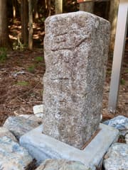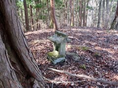 まだ10時半で昼食には早いので、水を飲んで休憩したのち、先に進む。巡視路のプラ階段を下って行くと、稜線の右側は大規模に伐採された斜面となる。行く手のピークとの間は小ギャップとなり、短い急坂を下る。最低鞍部付近の岩場の上には屋根が失われた石祠がある。塔身には「上久我村 鉄炮連」「明治十六(1883)年未十月廿五日」と刻まれている。
