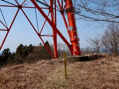 ピークの右(北)から送電線巡視路が通じていて、「南いわき幹線278号に至る」との黄色標柱がある。稜線を緩く下り、巡視路のプラ階段を登ると、樹林が切り開かれて開けた平地に巨大な紅白鉄塔が建つ日向倉頂上に着く。
