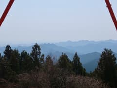 峠から稜線を辿る。杉植林帯に覆われて、藪はない。薄い踏み跡が続く。所々で右(東)側の樹林が切れて、粟野の三峰山や二股山、鶏鳴山辺りの山々が眺められる。