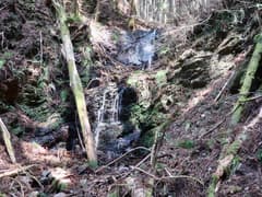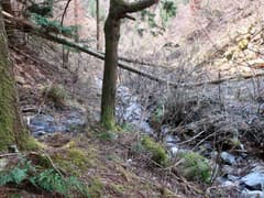 水のない窪を緩く下って行くと、徐々に谷が深くなり、右岸から小滝で落ちる水流を合わせる。さらに右岸から沢を合わせると、対岸の伐採地に荒れて藪っぽい作業道が現れる。