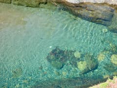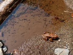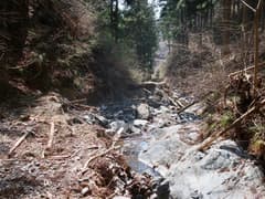 だんだん水量を増した渓流に沿って、作業道を下って行く。昨年の台風の被害か、あちこちで作業道が浸食・分断されている。車両による通行は全く出来なくなっており、林業への被害が大きそうだ。徒歩による通行は全く問題ない。正午を回ってすっかり春の陽気に包まれ、道端の水溜りでは親蛙に見守られて大勢のオタマジャクシが孵化している。