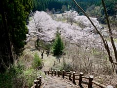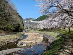 既に暑い位の陽気なので、Tシャツ+ライトパンツという夏山の出で立ちで出発。車道を下流側に戻り、展望台から松田川ダムを眺める。背後には猪子山〜知ノ岳の稜線が、低いながらもギザギザなスカイラインを描く。ダムの下流を俯瞰すると、「松田川ダムふれあい広場」と称するバーベキュー場/キャンプ場があり、満開の桜が一面に広がって見事だ。